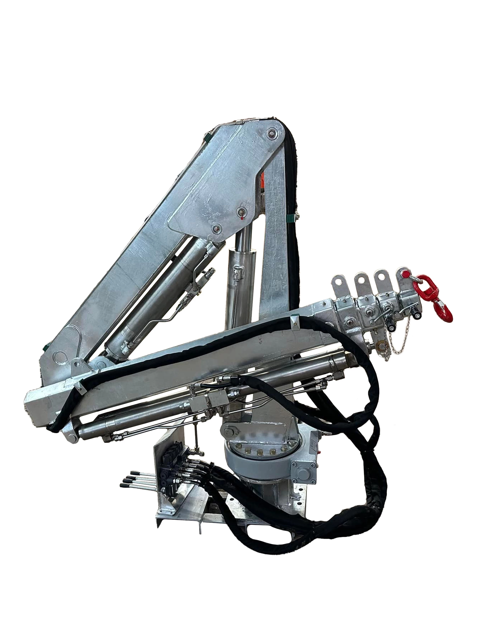 Kranen er godt egnet til løft opp og ned av lette fritidsbåter ved kai, materialpakker og til hjelpeløft ved småmontering. Den har to hydrauliske utskyt og to manuelle. Eksempler på styring er fast montert elektrisk styringspanel, styretablå på ledning og en direkte hydraulisk styringssentral. Det er disse tre variantene vi har testet her hos oss, og det har fungert utmerket. Når det kommer til pumpeaggregatet, har en mulighet til å bruke både 2×12, 24 og 220 volt. Pumpeaggregat må kjøpes i tillegg. Kranen kommer med 5 hydrauliske ledd, hvorav to hydrauliske utskyt og to manuelle. Total rekkevidde 6,6 meter. Denne kranen kan fås galvanisert, lakkert og med hydrauliske utskyt.