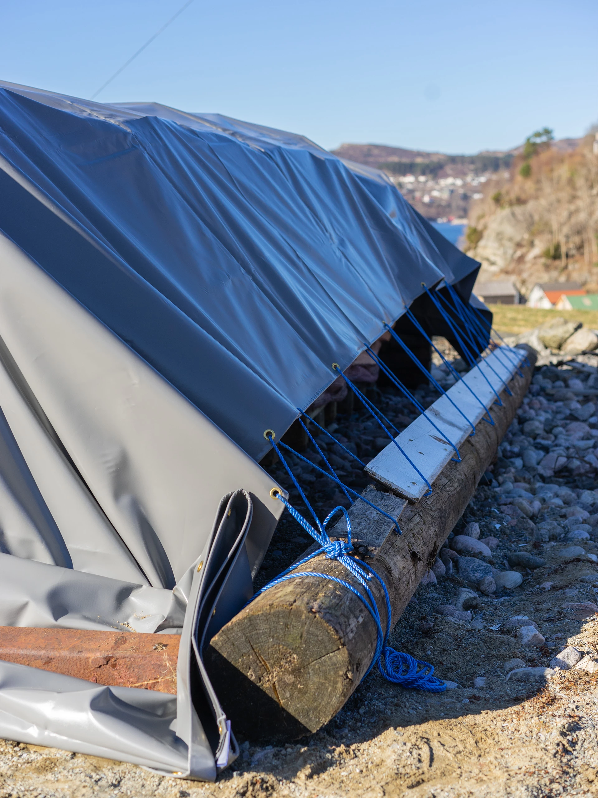 PVC 650 gram med merler i stål og innsydd tau rundt hele presenningen.