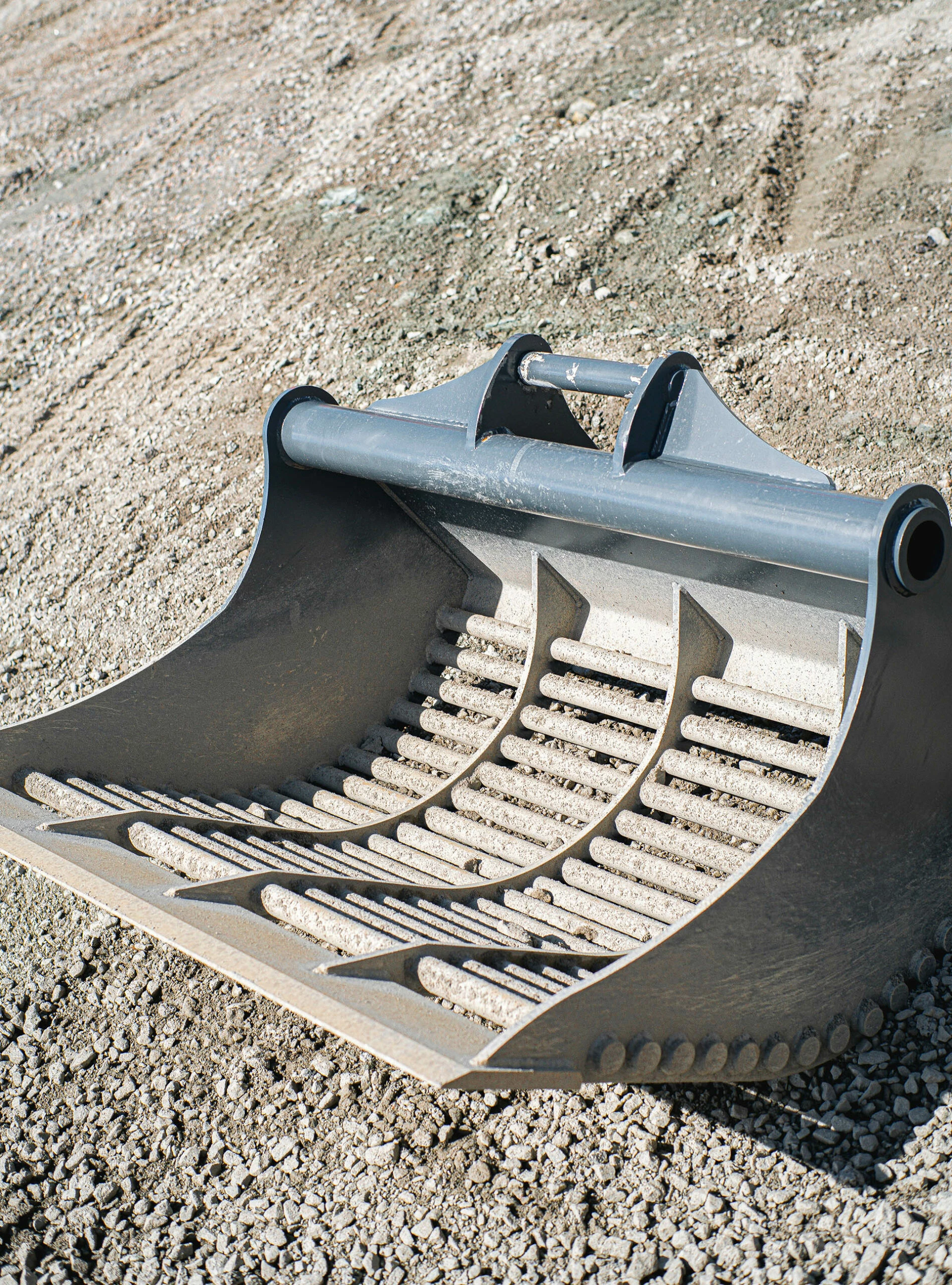 Sorteringsskuffe med flat topplate for påsveising av kundebestemt hurtigkobling, laget i de beste kvaliteter som Hardox 450. Med romslige mål og fin sikteavstand på 30mm egner denne skuffa seg til sortering og rensing der en ikke vil at noe stort skal ligge igjen.