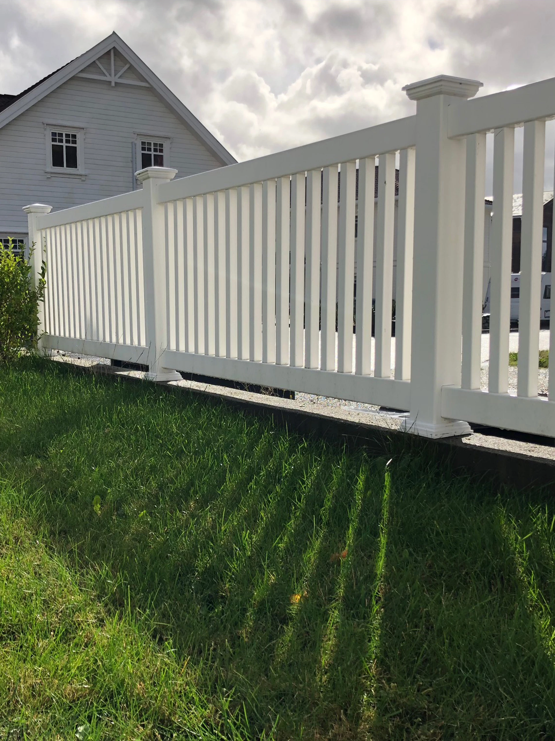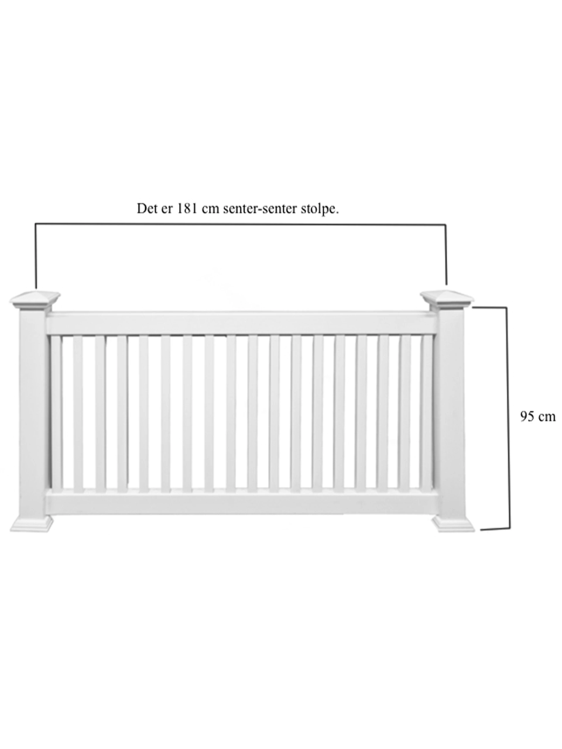 Vi leverer kraftige aluminiumsbraketter i gjerdestolpene som ikke ruster. Det er aluminiumsprofil i nedre vange for å motvirke sig. Elementene er 180 cm brede og 95 cm høye. Gjerdet kan brukes som rekkverk der nivåforskjeller til terrenget eller underliggende plan er mindre enn 3,0m. Nivåforskjellen måles fra overkant dekke.